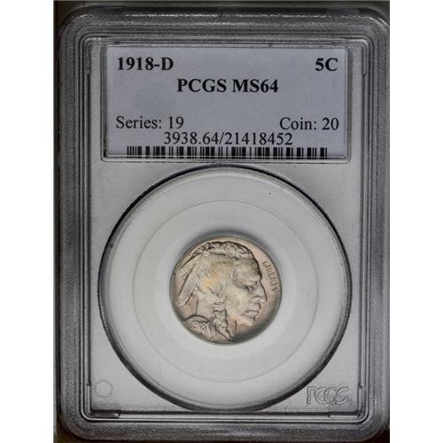 <B>1918-D<5C> MS64 PCGS.</B></I> Extremely lustrous with above-average definition for this more difficult Denver issue, overlaid in blushes of apricot patina. Mintmarked Buffalo nickels from 1918 are among the more elusive early issues. In fact, the 1918 Philadelphia issue's survival rate appears inconsistent with its published mintage, as David Lange notes.