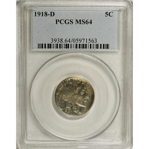 <B>1918-D 5C MS64 PCGS.</B></I> This charming near-Gem has light golden-brown and steel-blue patina. The centers are somewhat soft, but date and mintmark are fully struck, and the horn is well defined.<BR><BR><b>Shipping:</b> Coins & Currency (<a target="_blank" href="http://www.heritageauctions.com/common/shipping.php">view shipping information</a>)