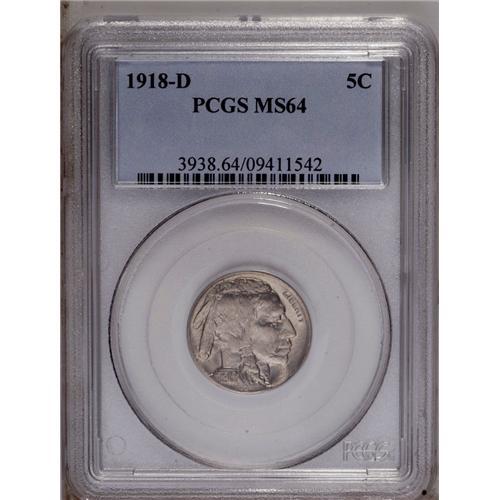 <B>1918-D<5C> MS64 PCGS.</B></I> This satiny gunmetal-gray near-Gem is refreshingly void of abrasions, and is only kept from a finer grade by the expected incompleteness of strike on LIBERTY, the tail, and the centers. Nonetheless, the bison's head, the mintmark, and other important design details are sharp.