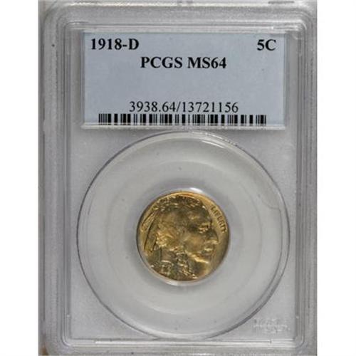 <B>1918-D 5C MS64 PCGS.</B></I> This satiny and unabraded near-Gem displays a few pinpoint cream-gray flecks and the expected minor incompleteness of strike in the centers. Early branch mint Type Two nickels are invariably scarce in such quality.<BR><BR><B>Coin Engraver:</B> James E. Fraser<BR><BR><b>Shipping:</b> Coins & Currency (<a target="_blank" href="http://www.heritageauctions.com/common/shipping.php">view shipping information</a>)