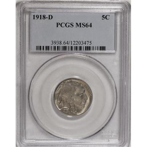<B>1918-D 5C MS64 PCGS.</B></I> Sharply struck with soft, pleasing luster. This near-Gem offers vibrant visual appeal with hints of gold and blue patina in the faintly marked fields. PCGS has graded 92 finer coins (1/08).<BR><I>From The John Stimson, Sr. Collection, Part Two.</B></I><BR><BR><B>Coin Engraver:</B> James E. Fraser<BR><BR><b>Shipping:</b> Coins & Currency (<a target="_blank" href="http://www.heritageauctions.com/common/shipping.php">view shipping information</a>)