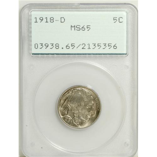 <B>1918-D 5C MS65 PCGS.</B></I> This attractive Gem is exceptionally well struck for the issue, and lacks any areas of obvious striking weakness. With even satiny luster and pleasing, slightly greenish steel-gray toning, this coin is much nicer than the average '18-D Buffalo nickel, from both the technical and aesthetic perspectives. Nearly blemish-free with a few scattered flyspecks on each side, and housed in a first-generation PCGS holder. Population: 63 in 65, 21 finer (10/06).<BR><BR><b>Shipping:</b> Coin/Currency (<a target="_blank" href="http://www.heritageauctions.com/common/shipping.php">view shipping information</a>)