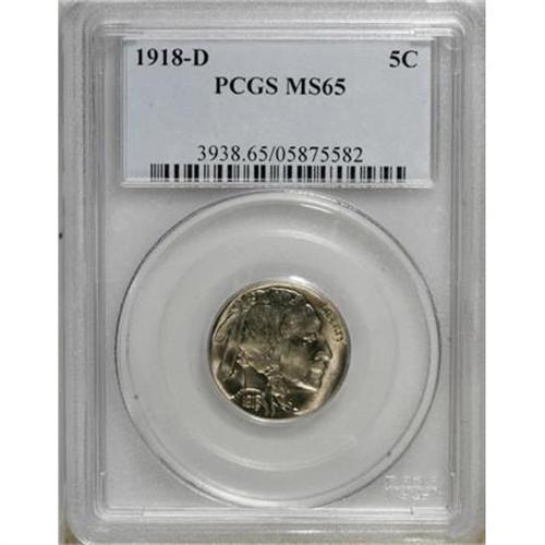 <B>1918-D 5C MS65 PCGS.</B></I> An attractive, minimally toned representative of this World War I-era issue, well-defined by Denver Mint standards of the time. Though struck from worn dies, as evidenced by erosion at the margins, this piece offers unusually strong luster. Pleasingly preserved and laudable in all respects. Population: 67 in 65, 21 finer (3/08).<BR><BR><B>Coin Engraver:</B> James E. Fraser<BR><BR><b>Shipping:</b> Coins & Currency (<a target="_blank" href="http://www.heritageauctions.com/common/shipping.php">view shipping information</a>)