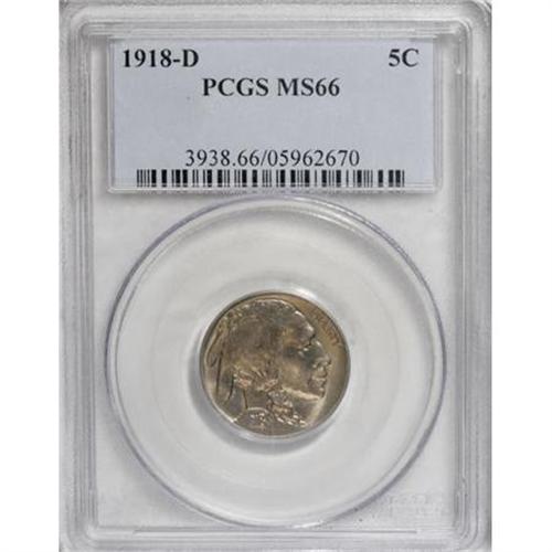 <B>1918-D 5C MS66 PCGS.</B></I> A remarkable example of this early and conditionally scarce branch mint issue. The strike is about as sharp as is possible to find on a 1918-D, since the tail, mintmark, LIBERTY, date, horn, and bison's shoulder all have splendid definition. Even the hair above the braid has pleasing detail. In addition, marks are essentially absent, and the satiny surfaces are lightly toned golden-tan. Population: 20 in 66, 1 finer (6/07).<BR><BR><B>Coin Engraver:</B> James E. Fraser<BR><BR><b>Shipping:</b> Coins & Currency (<a target="_blank" href="http://www.heritageauctions.com/common/shipping.php">view shipping information</a>\)