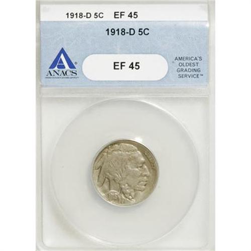 <B>1918-D 5C XF45 ANACS.</B></I> NGC Census: (21/348). PCGS Population (19/586). Mintage: 8,362,000. Numismedia Wsl. Price for NGC/PCGS coin in XF45: $193. (#3938)<BR><BR><B>Coin Engraver:</B> James E. Fraser<BR><BR><b>Shipping:</b> Coins & Currency (<a target="_blank" href="http://www.heritageauctions.com/common/shipping.php">view shipping information</a>)