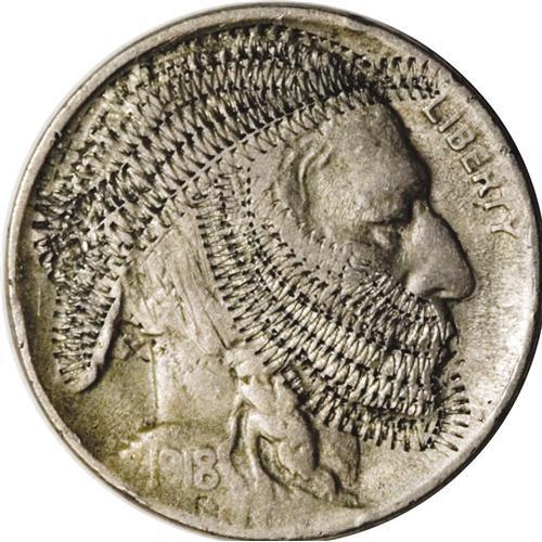 <B>1918-D:</B></I> An original work, but done entirely with (probably) a knurling tool. Little or no effort was exerted by this unknown artist to remove the original Indian design, as a good deal still is visible. The subject on this Very Fine graded coin is the typical hobo nickel artist's offering, a bearded man wearing a derby. This "carving" garners a Below Average grade.<BR><BR><b>Shipping:</b> Coin/Currency (<a target="_blank" href="http://www.heritageauctions.com/common/shipping.php">view shipping information</a>)