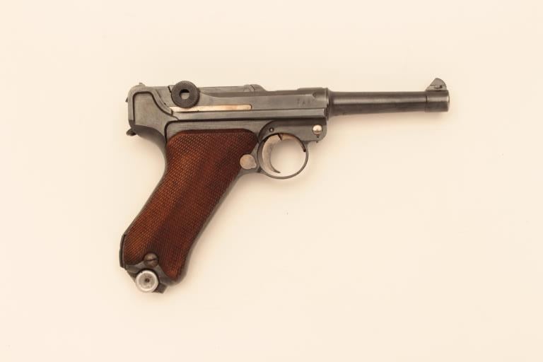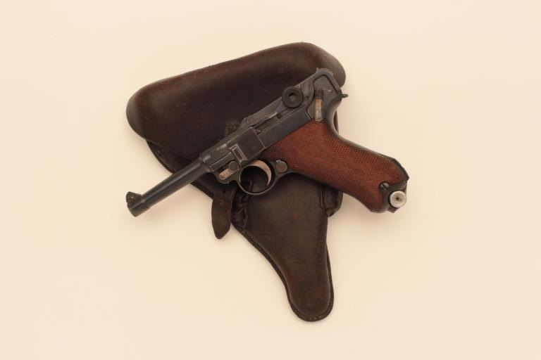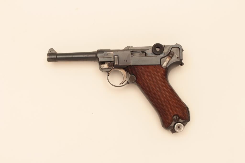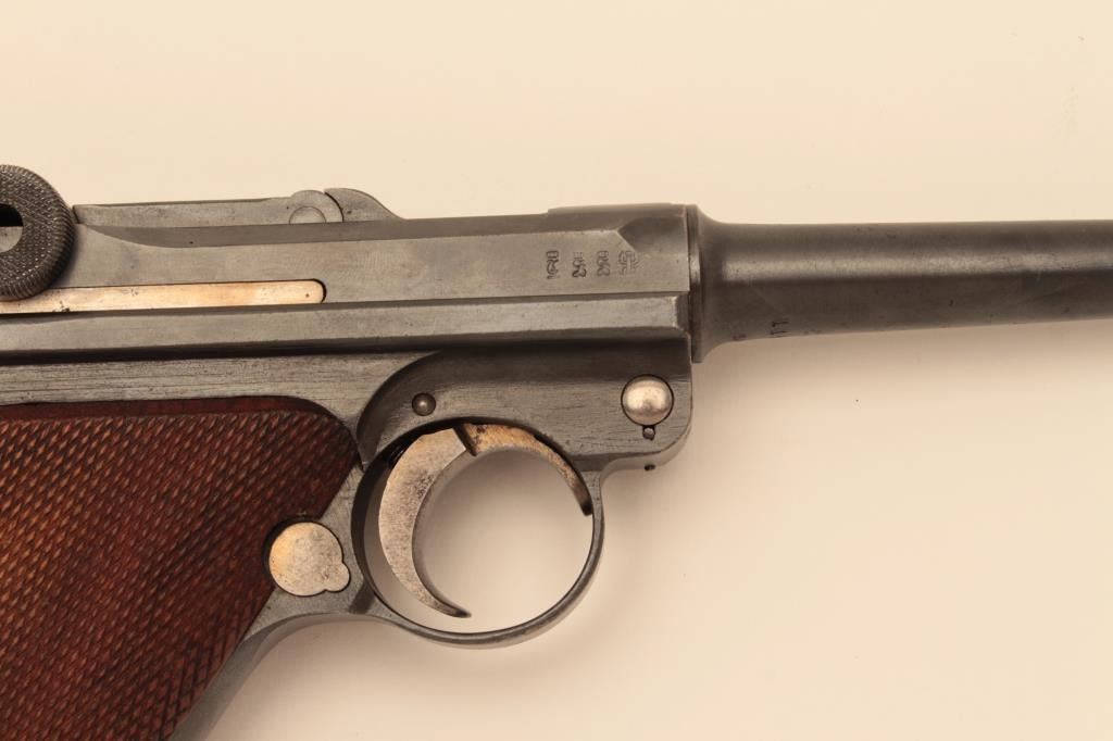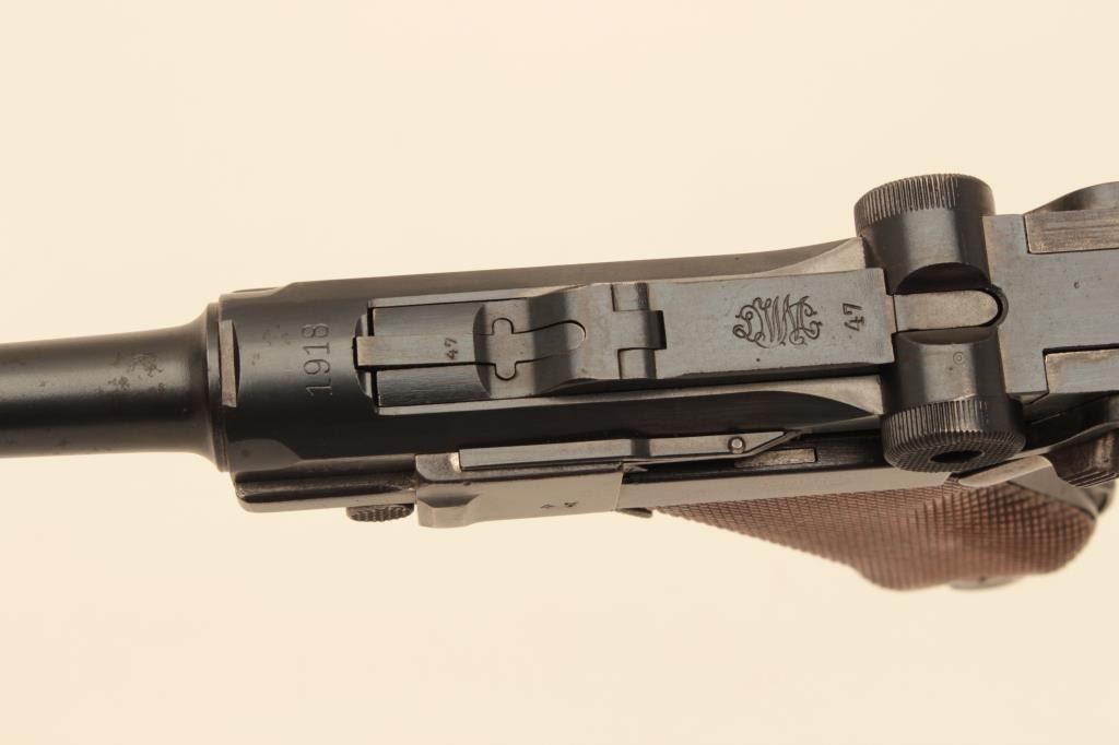 1918 DWM Luger in 9mm with sear safety added post WWI for Weimar Republic Police use, S/N 1147a. 95% period blue finish with some minor erosion and pitting on the barrel from holster. Very good plus checkered wood grips. Some straw finish and niter blue on the springs. Matching visible Numbers except magazine. Bright bore and interior shows limited use. The magazine is numbered 122 with aluminum bottom. A 1926 dated andproofed holster by Berlin maker included (Holster is fair to good). A nice rig. (C&R/No PPT) Est.: $700-$1400
