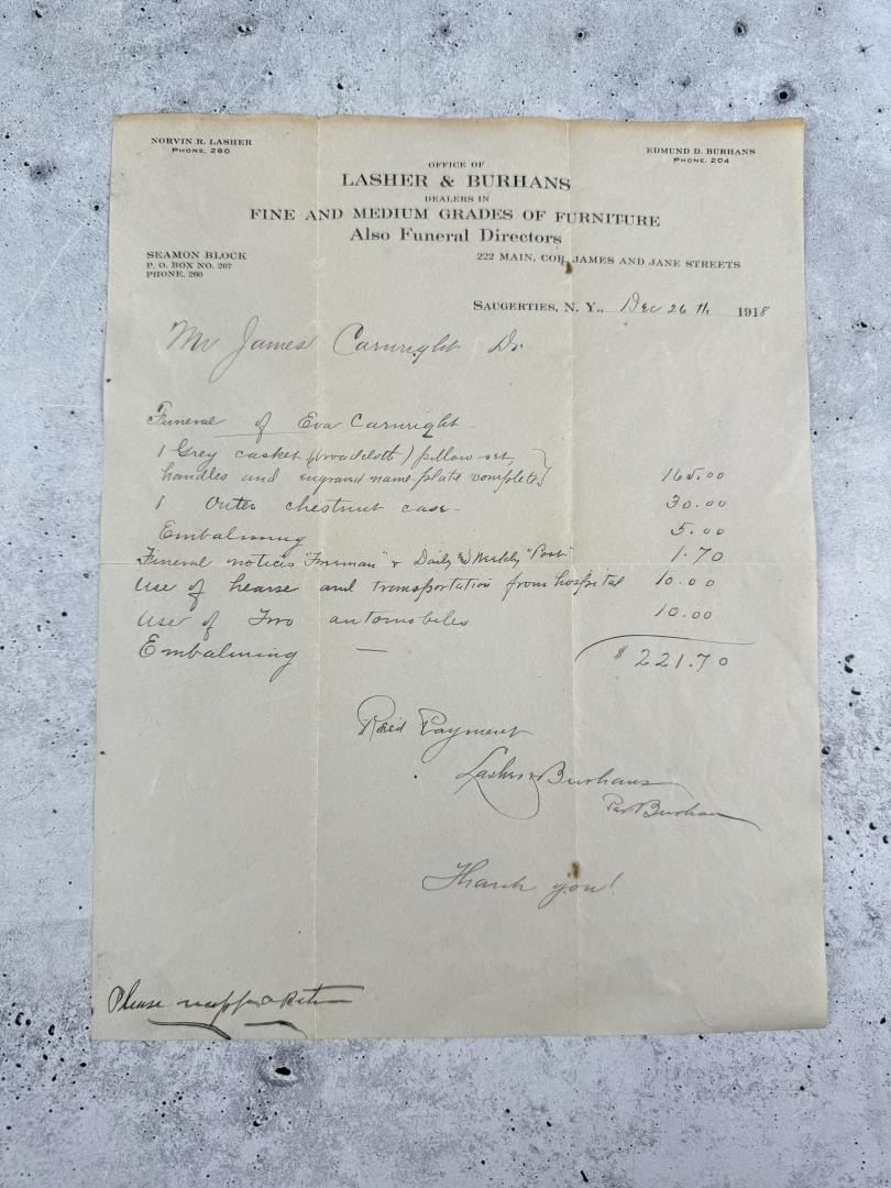 Saugerties New York. Receipt for the Funeral, Hearse, Embalming and Casket of one Eva Cartwright.