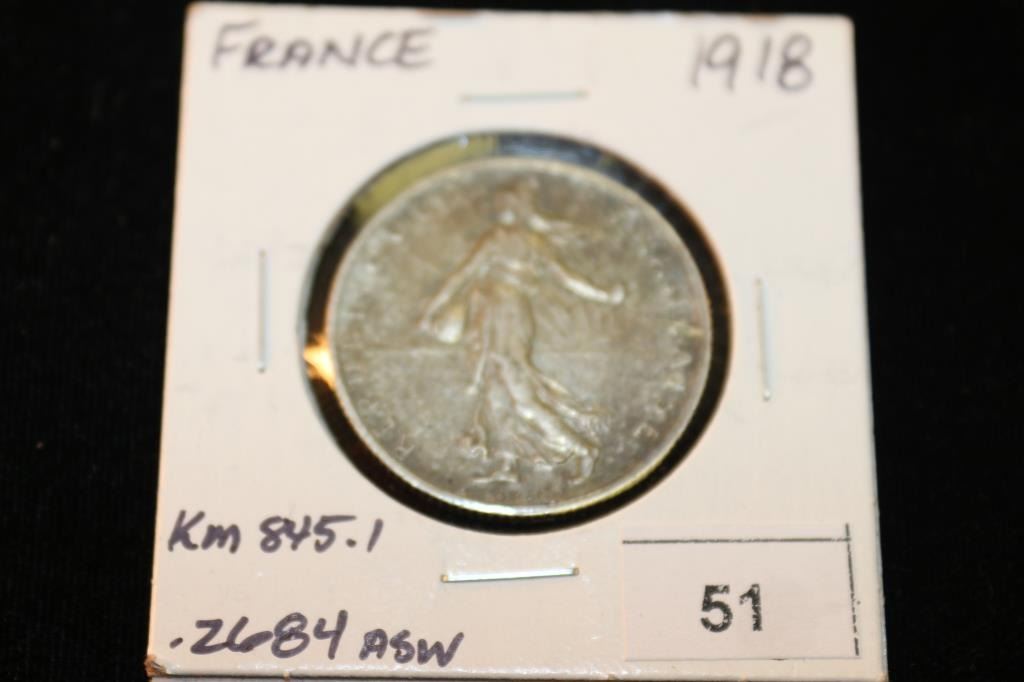 1918 FRANCE SILVER 2 FRANC .2684 OZ. ASW