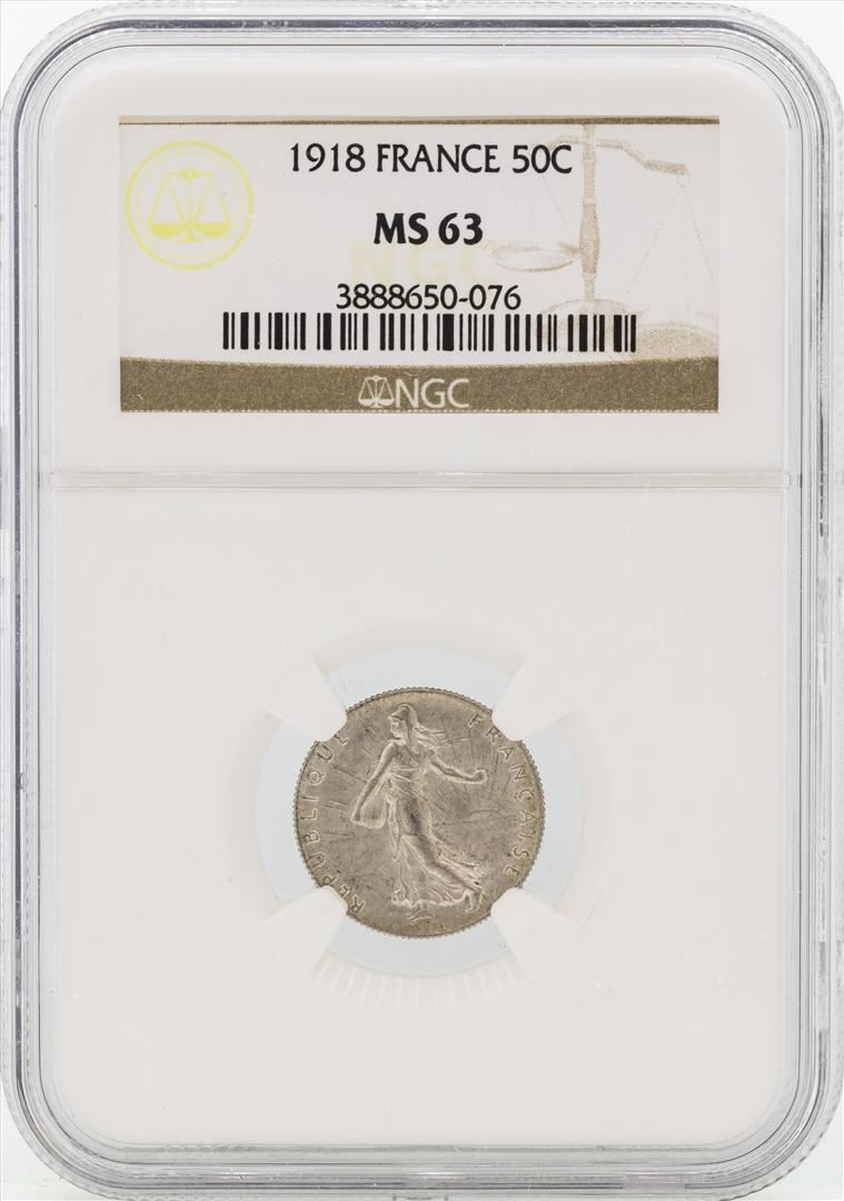 One 1918 France 50 Centimes Silver Coin NGC MS63. NGC Certified.