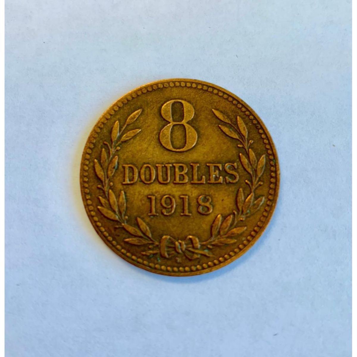 Obverse Coat of arms above wreath Lettering: GUERNESEY Reverse Denomination and date within wreath Lettering: 8 DOUBLES 1914 H Edge Smooth Specifications Country: Guernsey Type: Standard circulation coin Years: 1914-1949 Value: 8 Doubles (1/240) Currency: Pound (1827-1971) Composition: Bronze Weight: 9.7 g Diameter: 31.7 mm Thickness: 1.75 mm Shape: Round