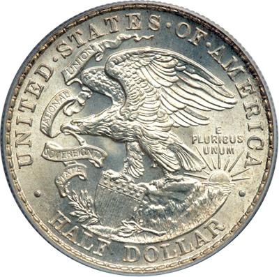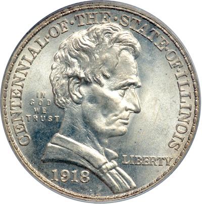 1918 Illinois Half Dollar. PCGS graded MS-66. Mostly untoned, this is a noteworthy example has barely patinated frosty luster and shows pinpoint striking definition throughout Lincoln's hair; the fields are largely free of distracting contact marks, hence the desirable 66 grade. This style of border ornamentation is identical to the one used on the obverse of the then-current standing Liberty quarter dollars (PCGS # 9320) .