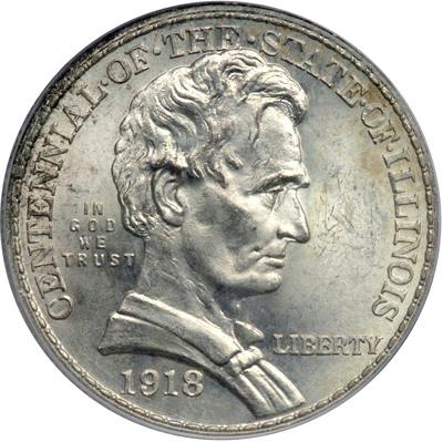 1918 Illinois Half Dollar. PCGS graded MS-66. A hint of light tone on this well struck Lincoln commemorative. Abraham Lincoln, before he became President, was a successful Illinois lawyer for the railroads (PCGS # 9320) .