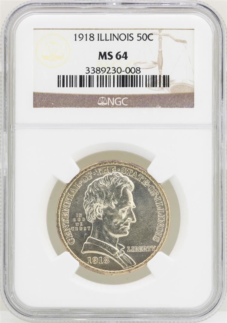 One 1918 Illinois Centennial Commemorative Half Dollar Coin NGC MS64. NGC Certified.