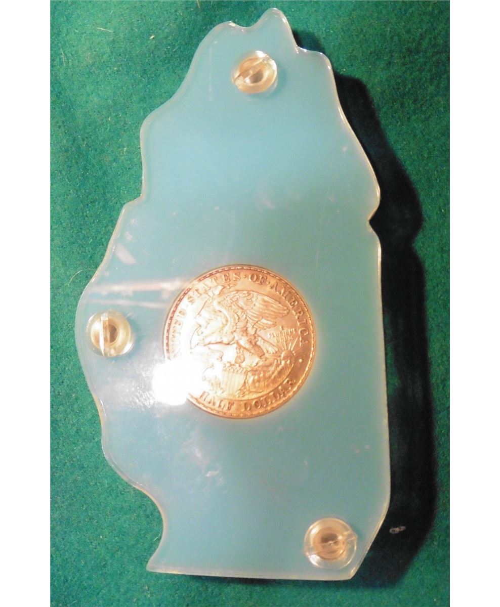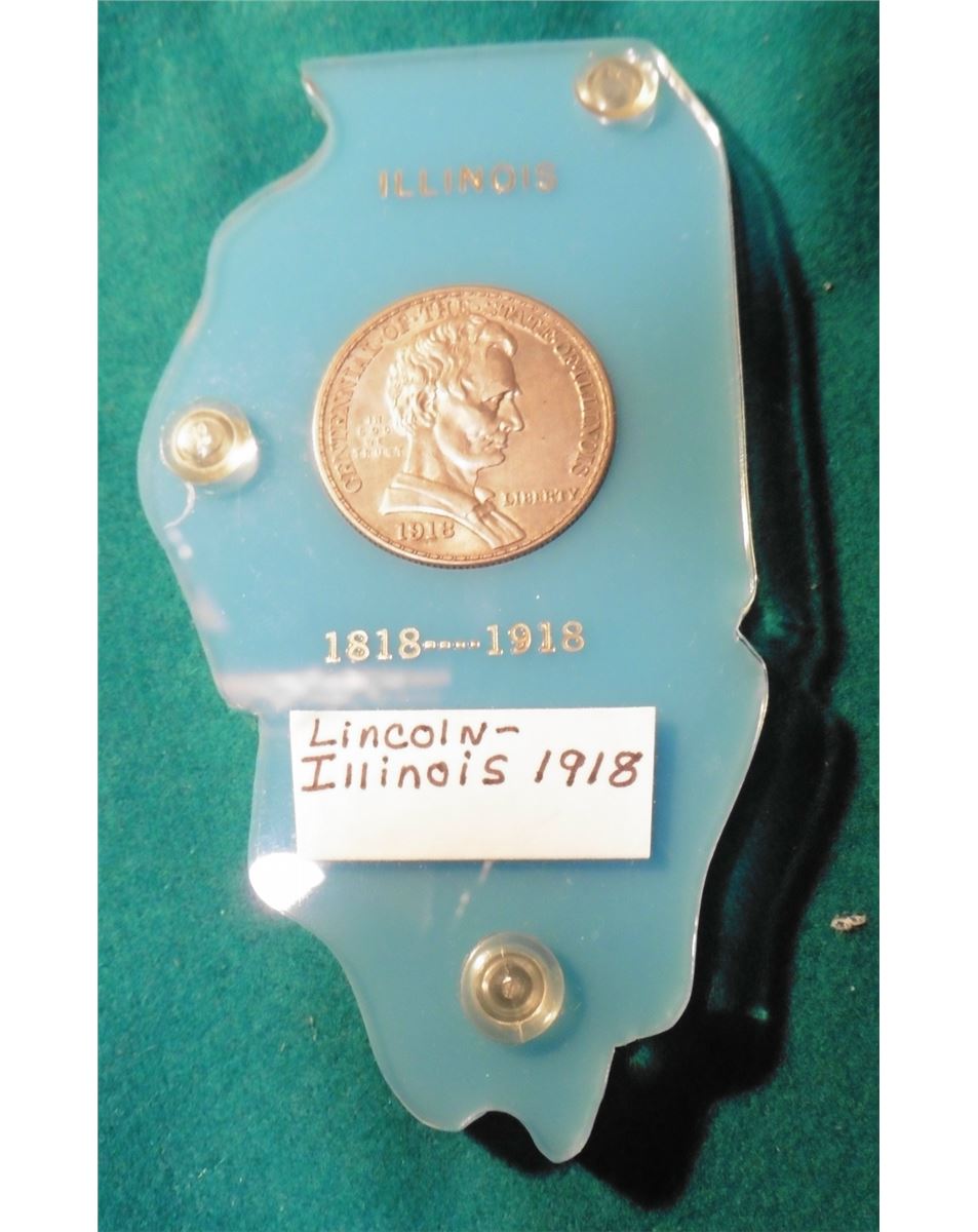 1918 Illinois Centennial Commemorative Silver Half-Dollar in an Illinois map shaped Capital style holder, blue with gold-lettering. Unc.