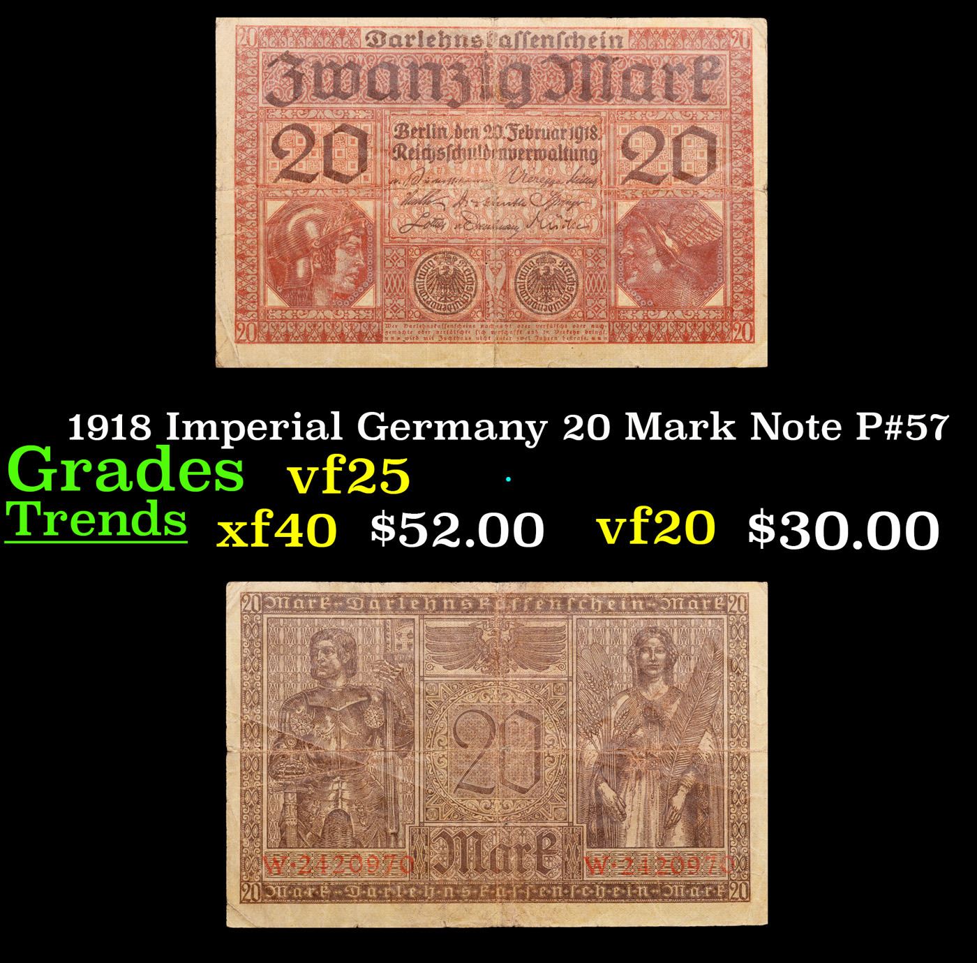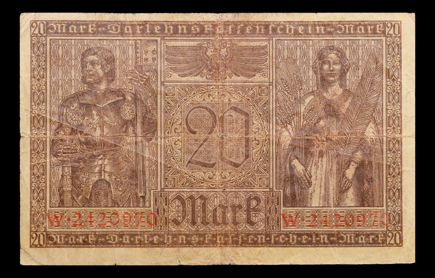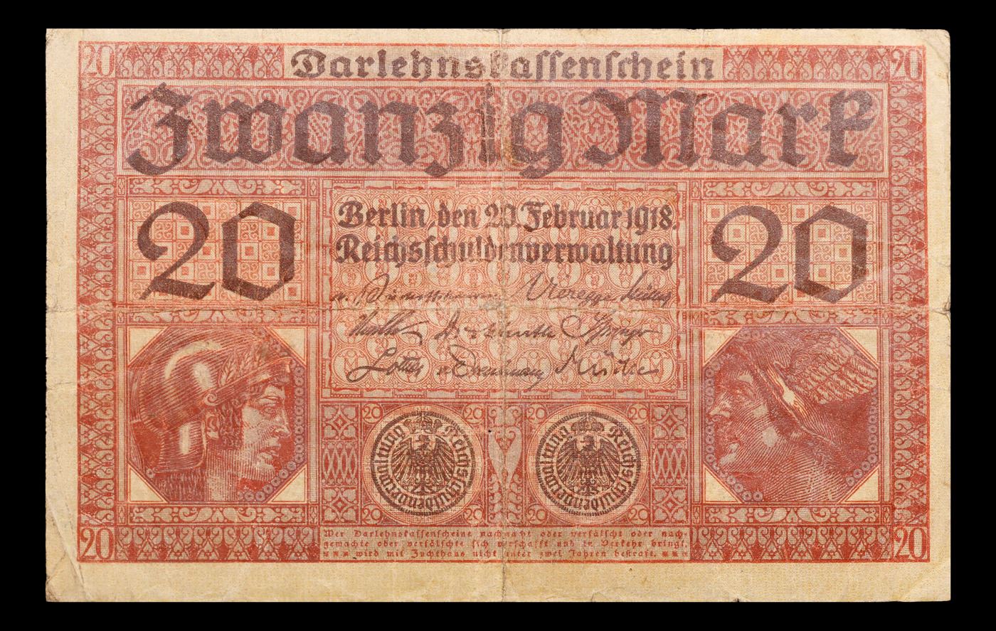 1918 Imperial Germany 20 Mark Note P#57 Grades vf+. In August 1914, Directly after the onset of WW1, the German Empire removed the gold backing of the mark and issued new currency. After the fall of the German Empire in 1918, the newly formed German Weimar Republic issued another new currency, known derisively as the "Paper Mark", which faced massive hyperinflation.