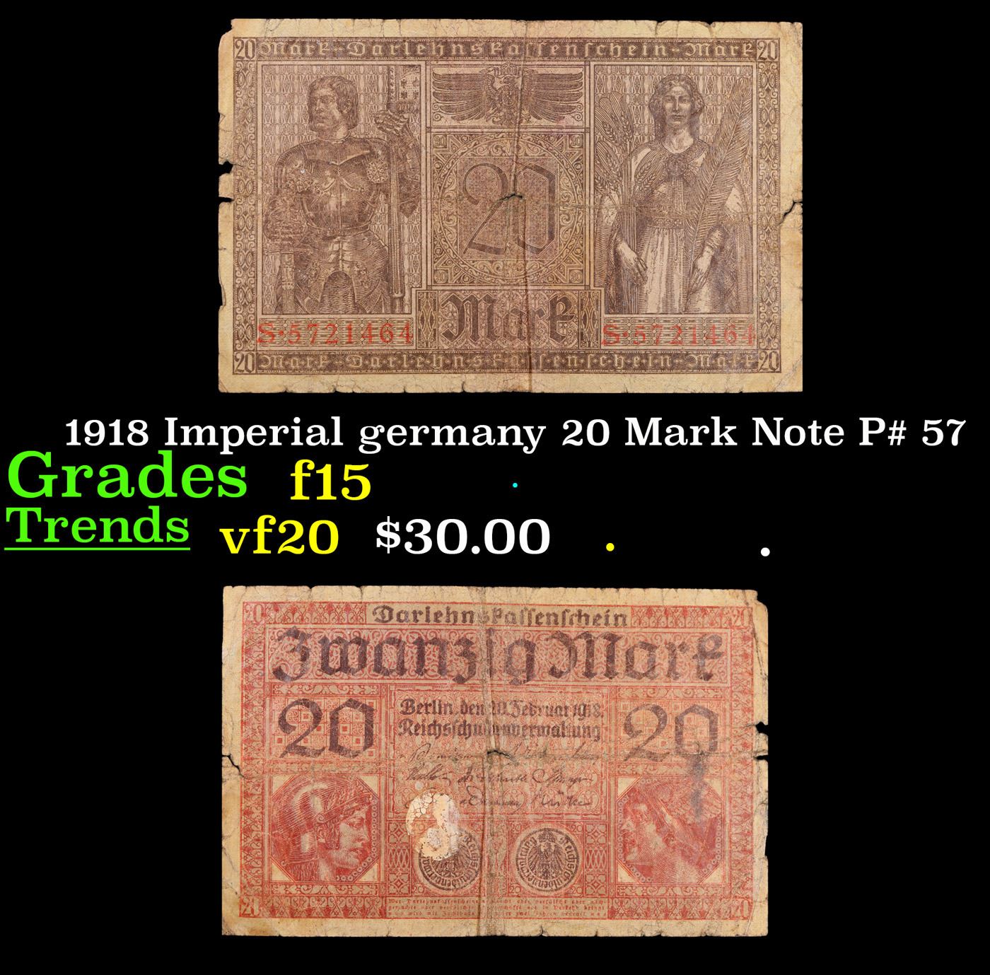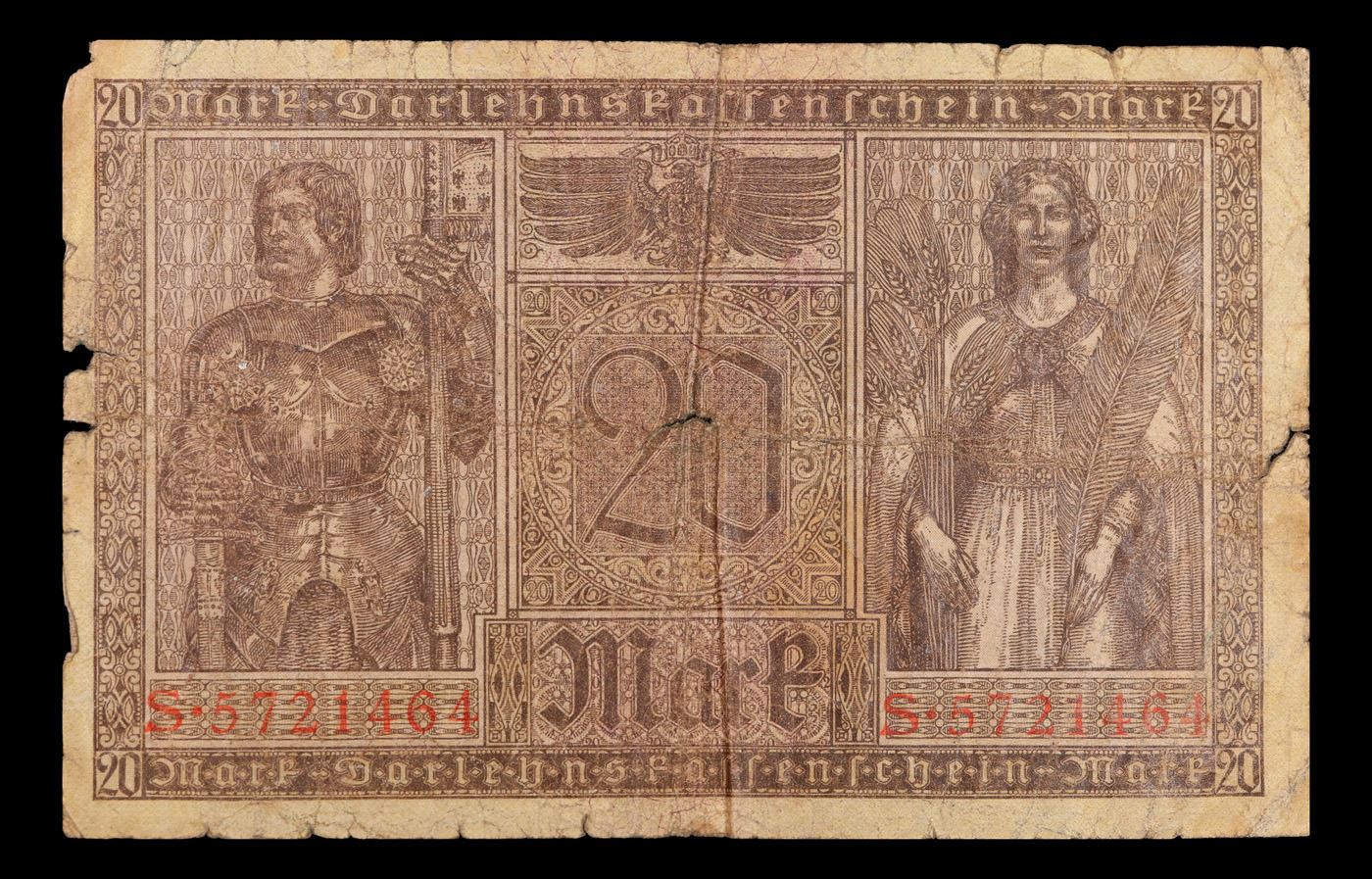 1918 Imperial germany 20 Mark Note P# 57 Grades f+. In August 1914, Directly after the onset of WW1, the German Empire removed the gold backing of the mark and issued new currency. After the fall of the German Empire in 1918, the newly formed German Weimar Republic issued another new currency, known derisively as the "Paper Mark", which faced massive hyperinflation.