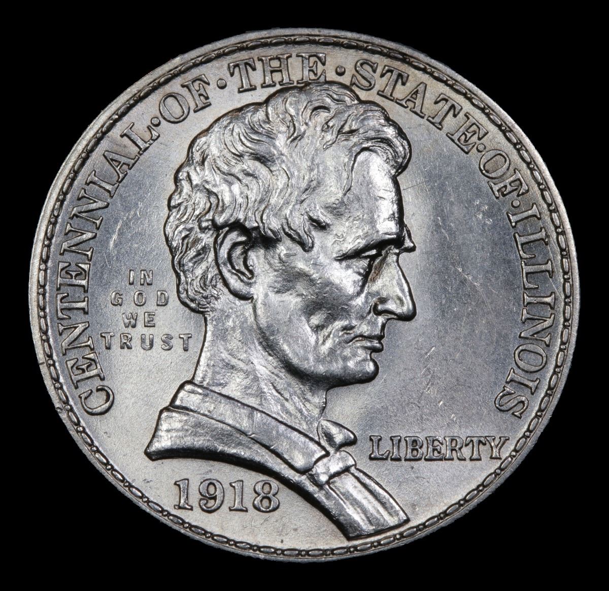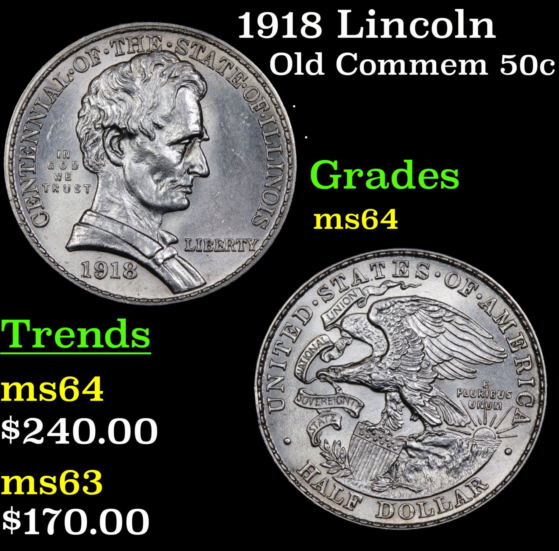 1918 Lincoln Old Commem Half Dollar 50c Grades Choice Unc. It is Interesting to note that the Portrait of Lincoln on the Obverse shows him Without a Beard as he appeared when he was in Illinois! The Obverse was Designed by George Morgan and the Reverse was One of John Sinnock's First Designs. George Morgan was the Chief Engraver at the time of the US Mint and Sinnock would be his successor, so two U.S. Mint Directors Designed this Beautiful Commemorative! Points to check for wear include Lincoln�s Cheekbone, Jaw, Eyebrow and the Hair Above His Ear. On the Reverse, examine the Eagle�s Breast Feathers and the Grass Beneath its Left Claw.