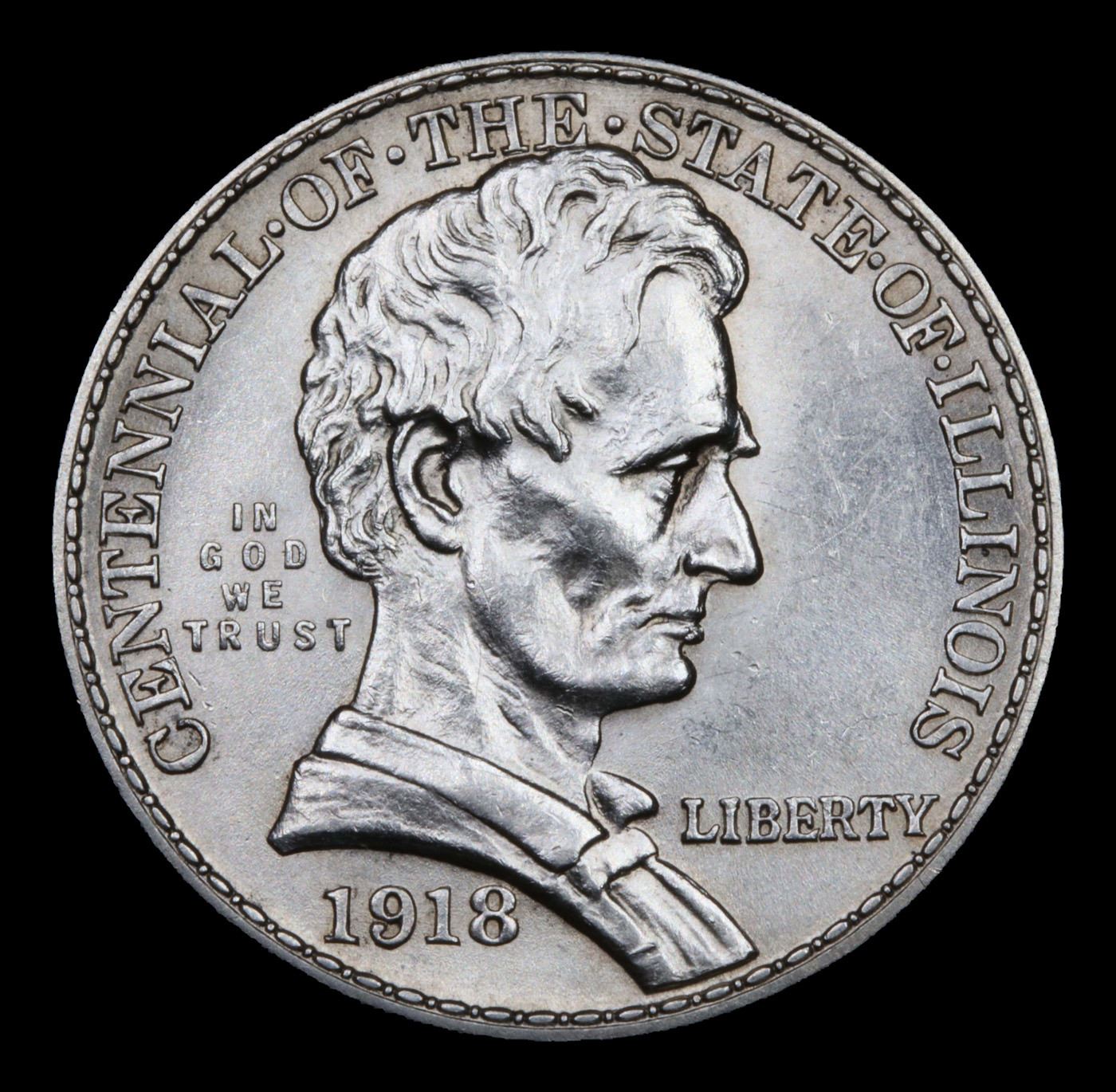 1918 Lincoln Old Commem Half Dollar 50c Grades Choice+ Unc. It is Interesting to note that the Portrait of Lincoln on the Obverse shows him Without a Beard as he appeared when he was in Illinois! The Obverse was Designed by George Morgan and the Reverse was One of John Sinnock's First Designs. George Morgan was the Chief Engraver at the time of the US Mint and Sinnock would be his successor, so two U.S. Mint Directors Designed this Beautiful Commemorative! Points to check for wear include Lincoln’s Cheekbone, Jaw, Eyebrow and the Hair Above His Ear. On the Reverse, examine the Eagle’s Breast Feathers and the Grass Beneath its Left Claw.