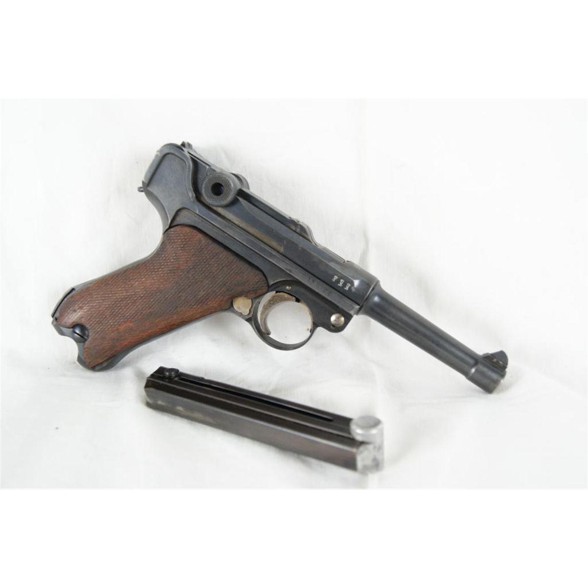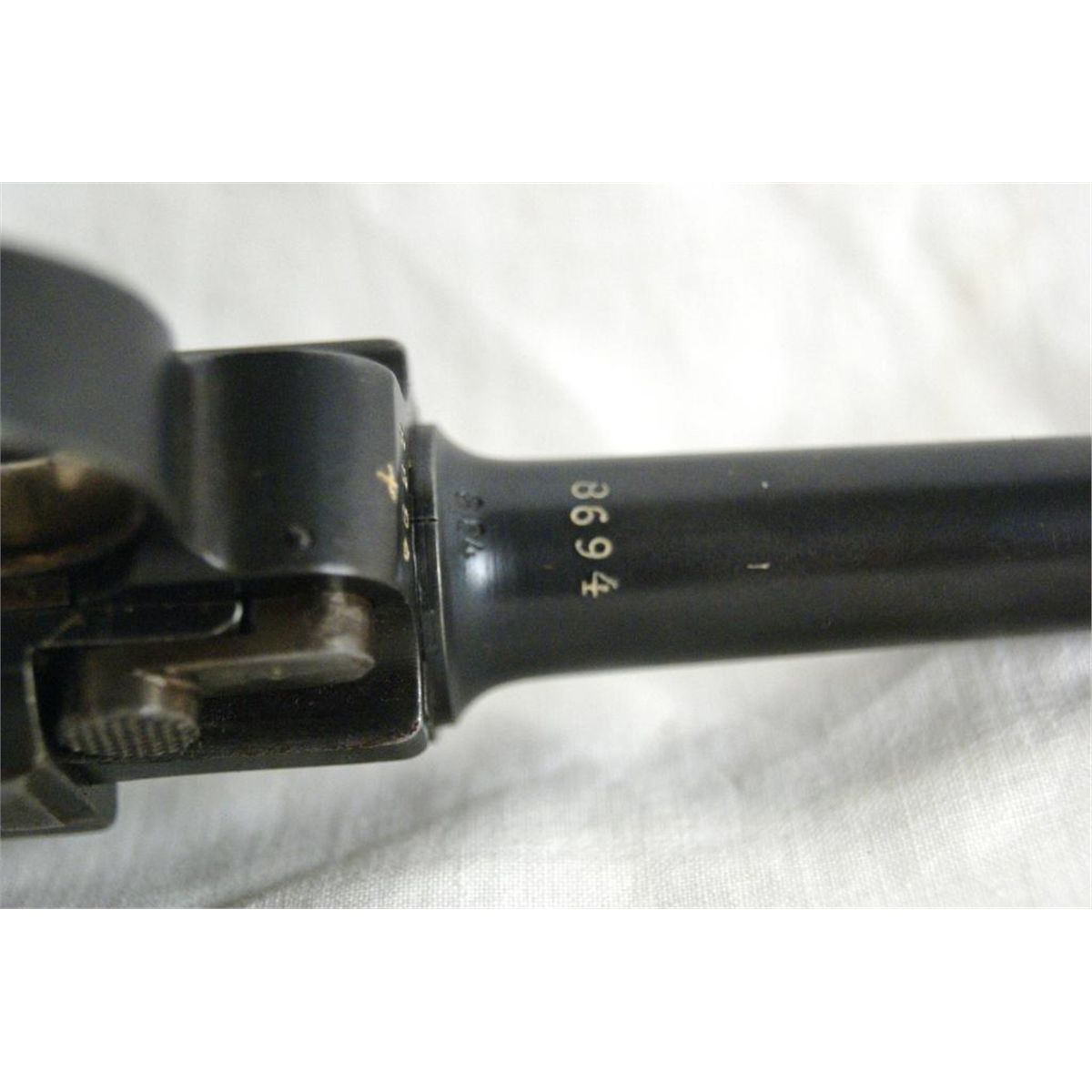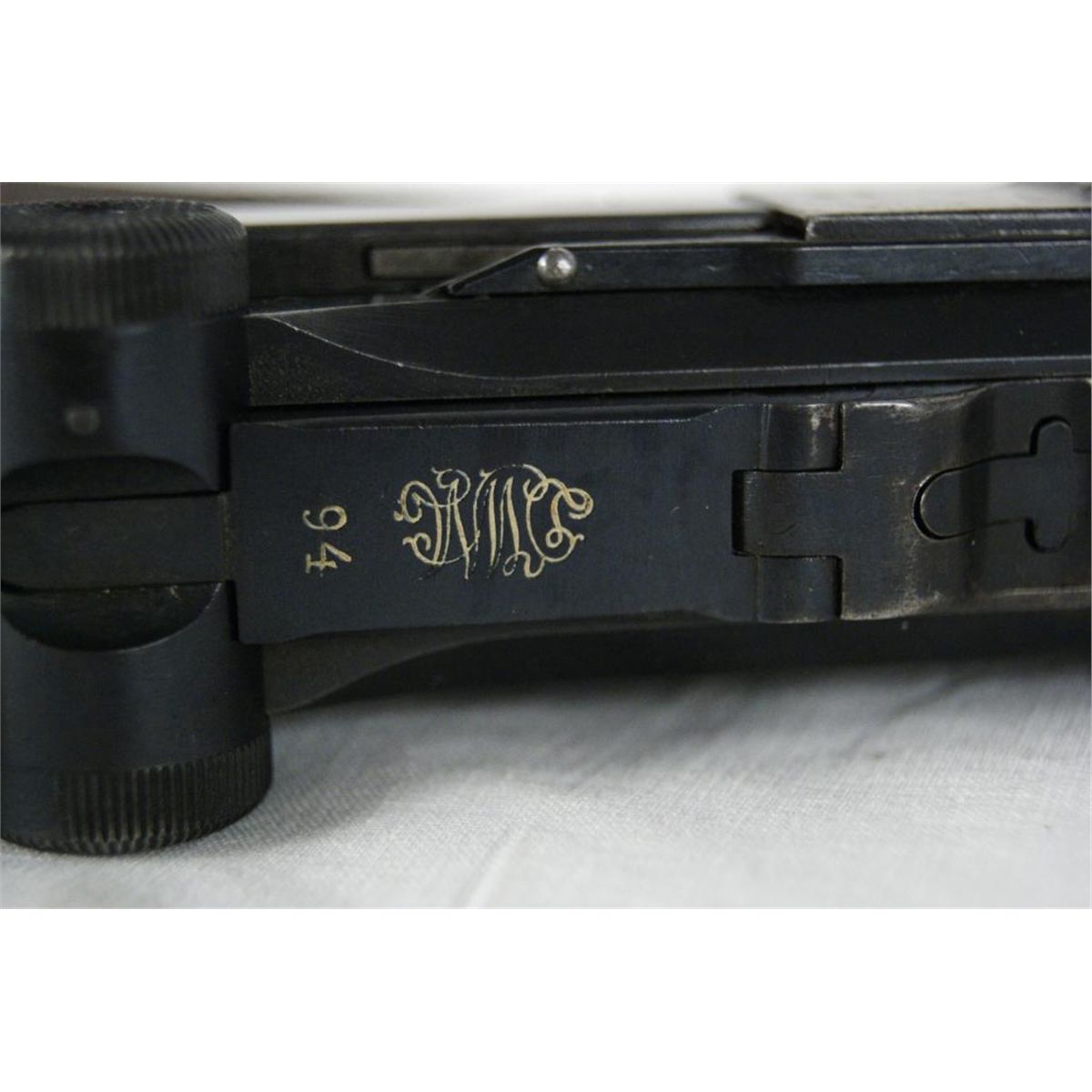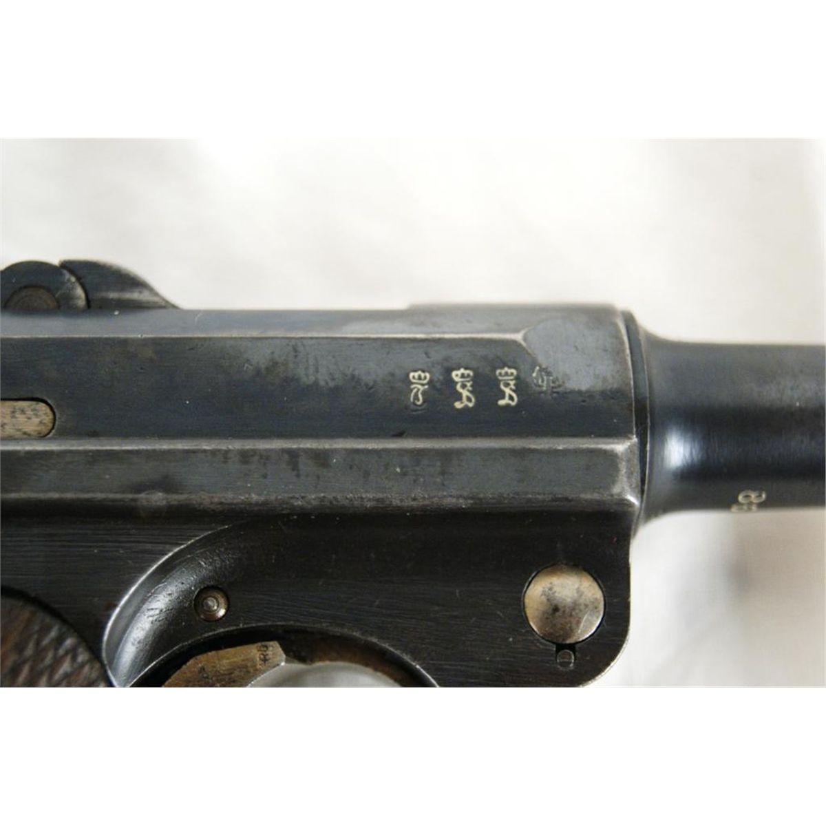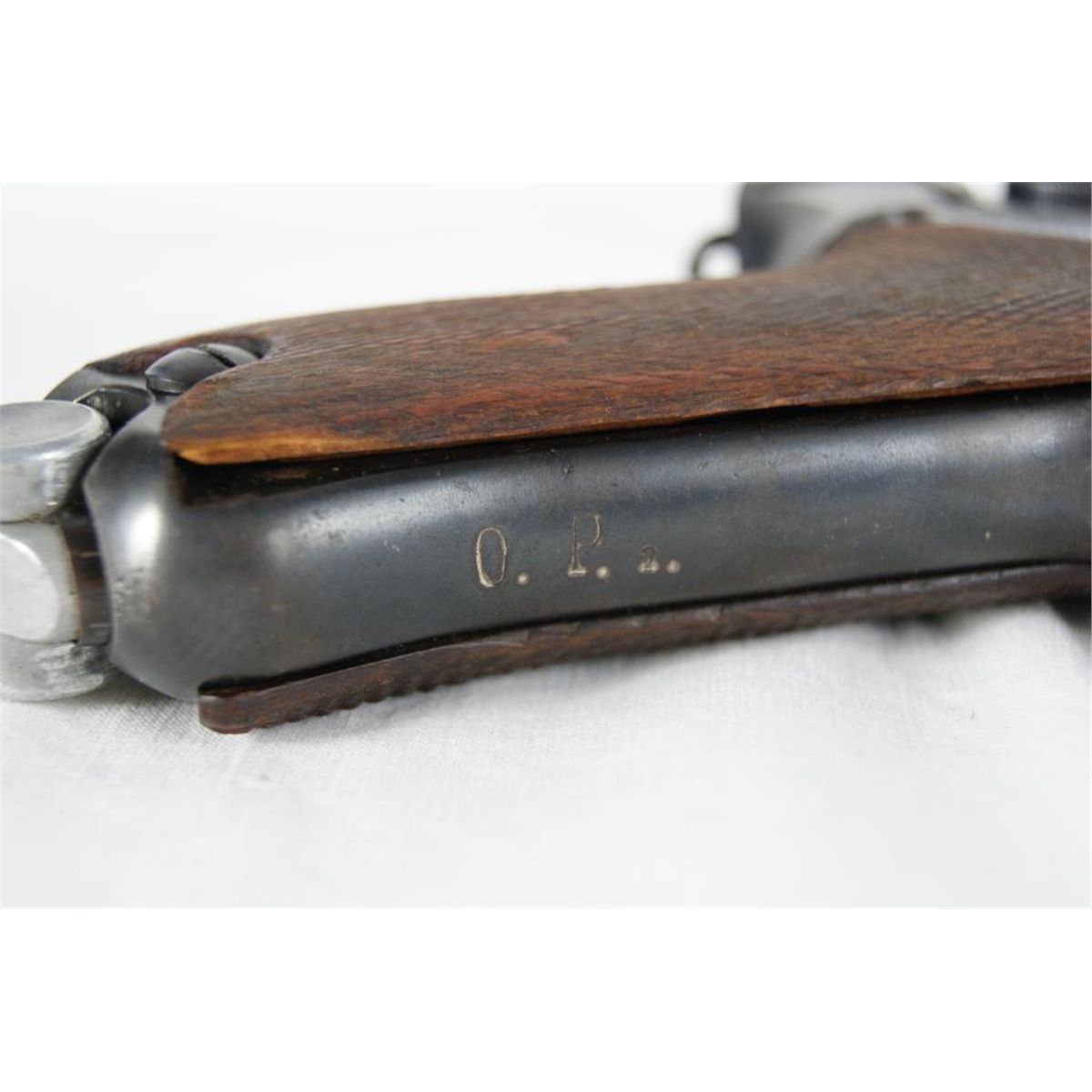 very good - excellent condition and excellent bore, with 2 small chips on one grip. DWM monogram on the toggle. The right side of the barrel extension is marked with three "Crown over Script" proofs, one Imperial Eagle proof, with an "eagle/ swastika" under the barrel Checkered grips and a nickel magazine. Some very small signs of rust. Marked O.P.2. on inside of handle