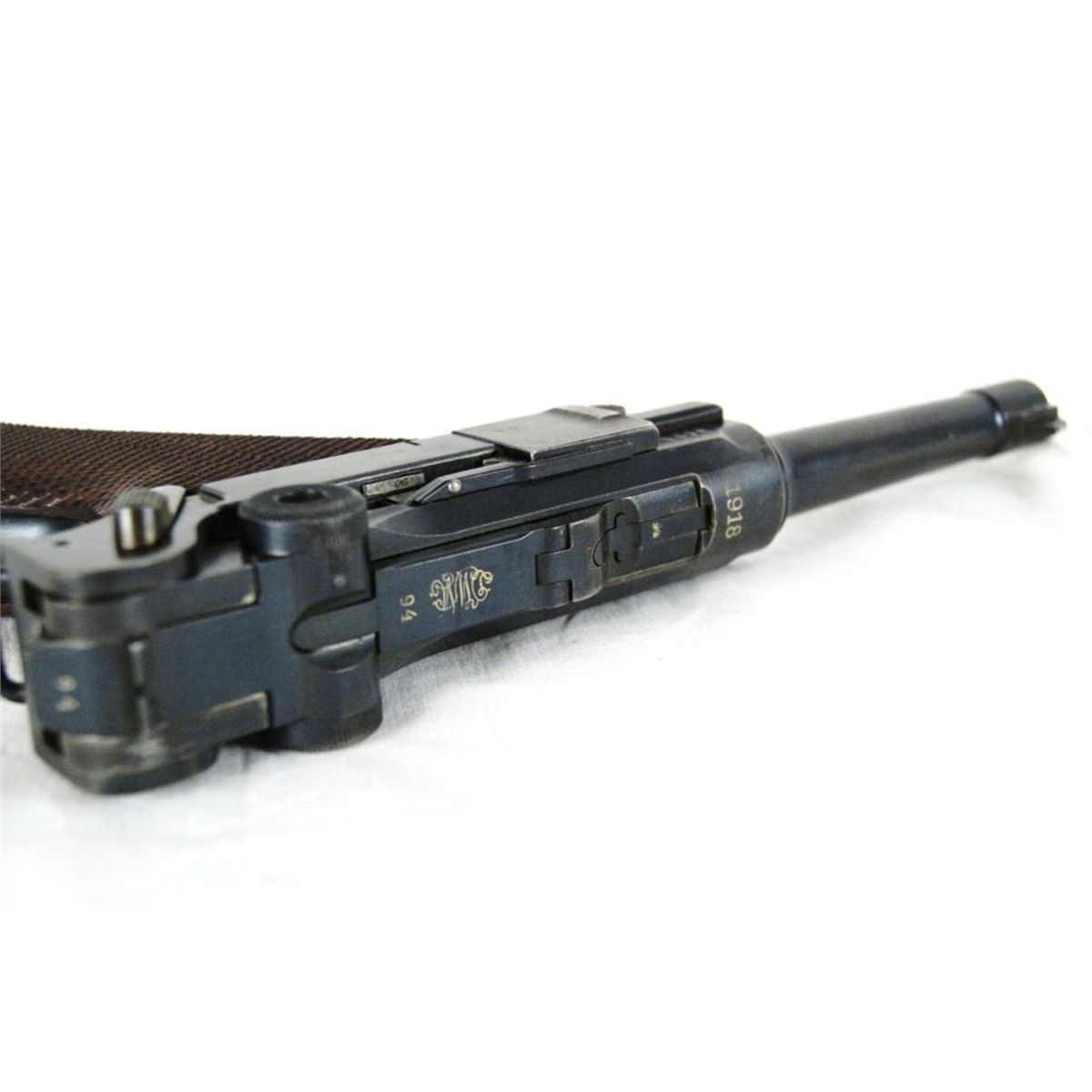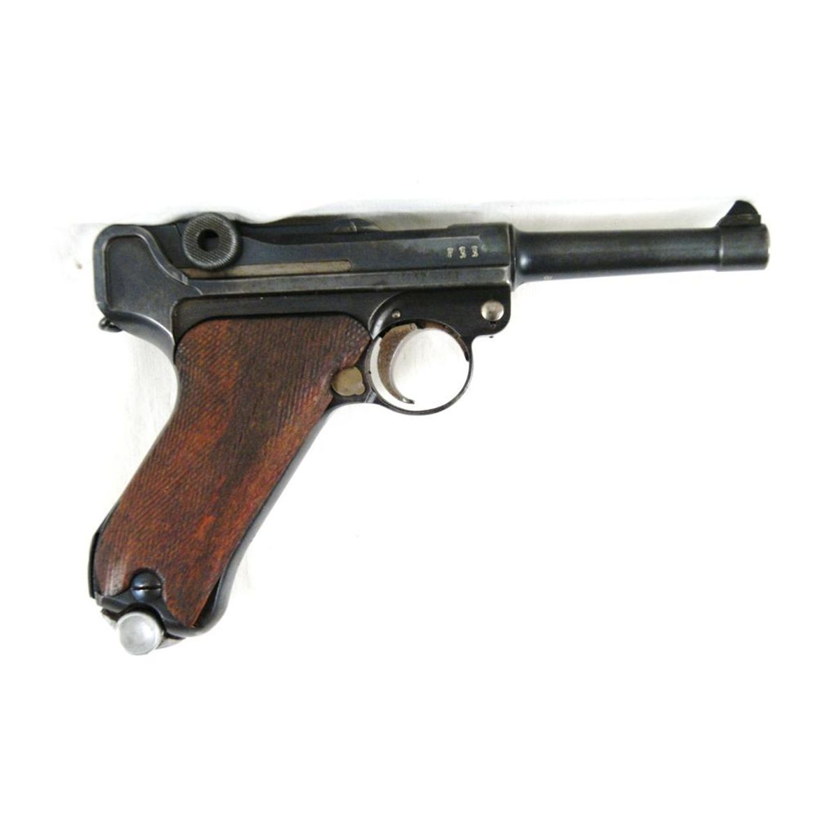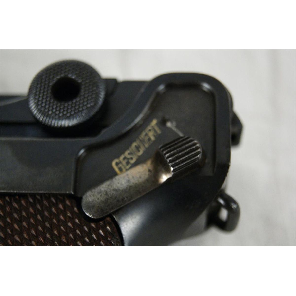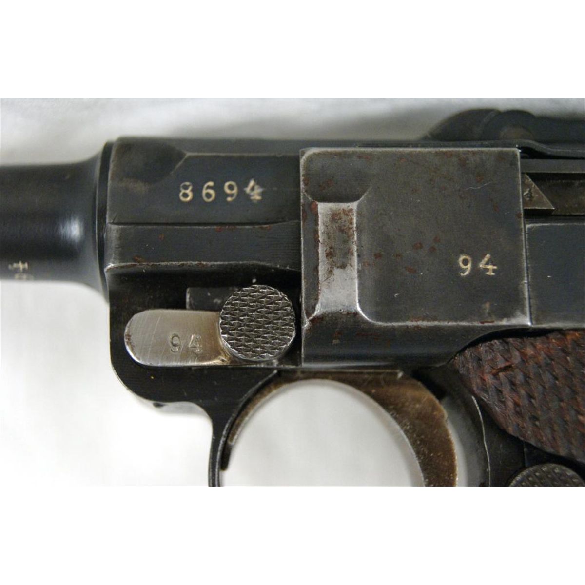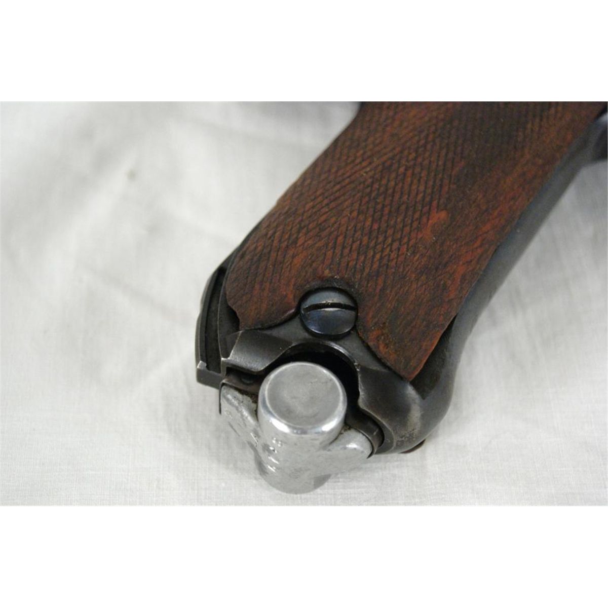 very good - excellent condition and excellent bore, with 2 small chips on one grip. DWM monogram on the toggle. The right side of the barrel extension is marked with three "Crown over Script" proofs, one Imperial Eagle proof, with an "eagle/ swastika" under the barrel Checkered grips and a nickel magazine. Some very small signs of rust. Marked O.P.2. on inside of handle