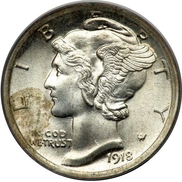 1918 Mercury Dime. PCGS graded MS-65 Full Bands. Well struck and mostly white except the obverse side from 7:00 to 9:00. Desirable in this Full Bands grade. Pop 92; 41 finer at PCGS (PCGS # 4917) .