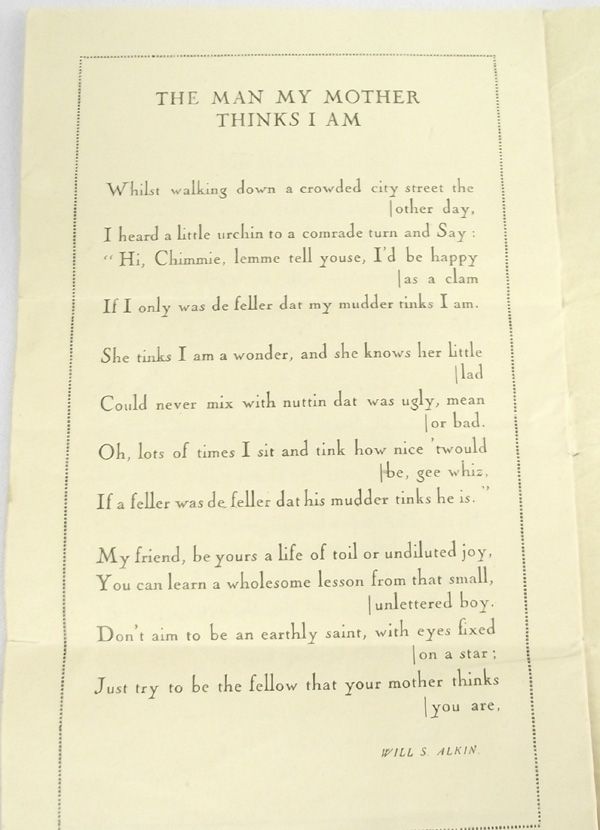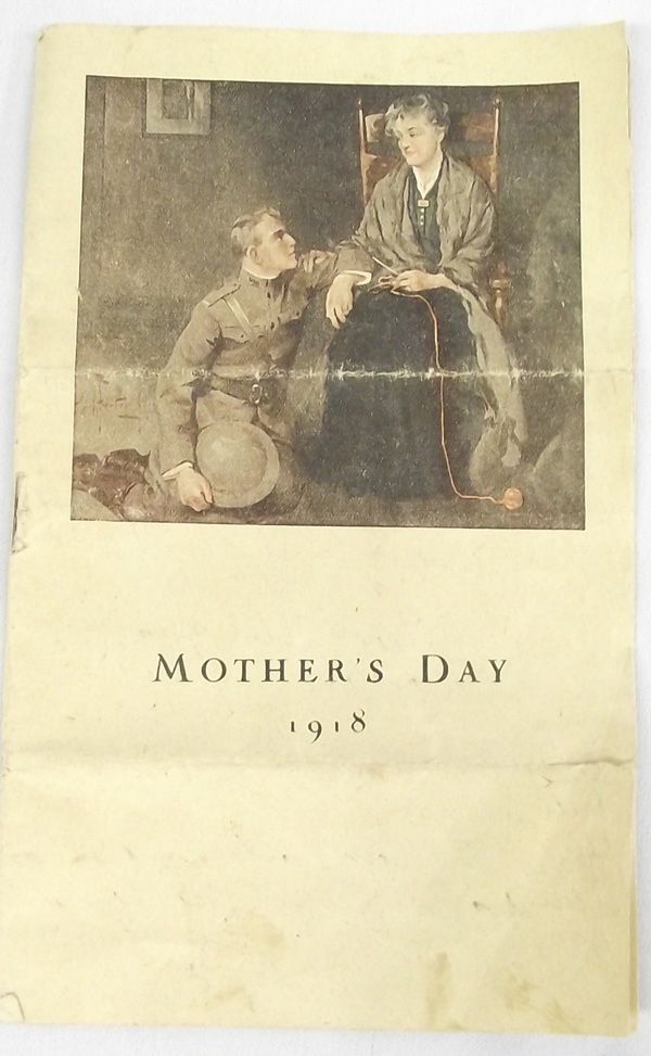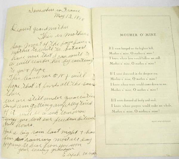 1918 Mother's Day Card With Handwritten Note. This is a paper booklet with poems from various poets about ''mother''. On the inside cover is a handwritten note dated May 12, 1918 from Elijah Wright to his grandmother, written while he was stationed in service. It measures 8.25''H x 5-1/8''W.