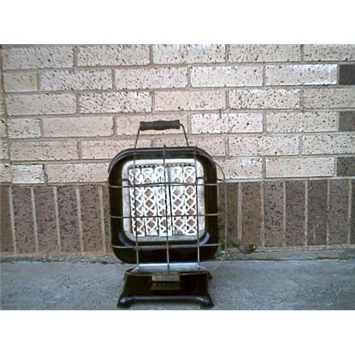 A very dark Cobalt Blue baked-on-enamel-coated-metal open flame portable heater. It had a flexible rubber hose attached to feed the natural[or methane]gas so it could be moved from room to room. Patent dates:1908,1916,1917,1918 and other patents pending. Has a nickel-plated tilt base. Attached gas-pipe adds 5" for a total width of 15.5", and the (folding) carrying handle adds 2.5" for a height of 18.6". Slight wear marks in enamel where grill attaches.
