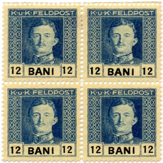 1918 Romania 12b Austria Occupation Carl 4 Block Error (STM-0473)