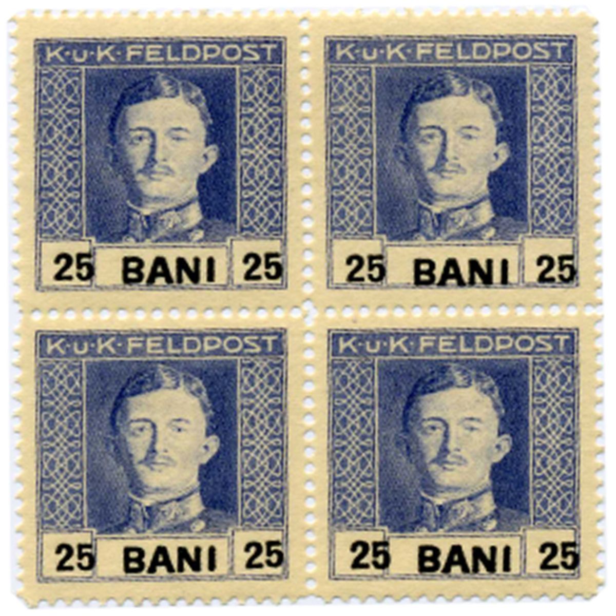 1918 Romania 25b Austria Occupation Carl 4 Block Error (STM-0470)