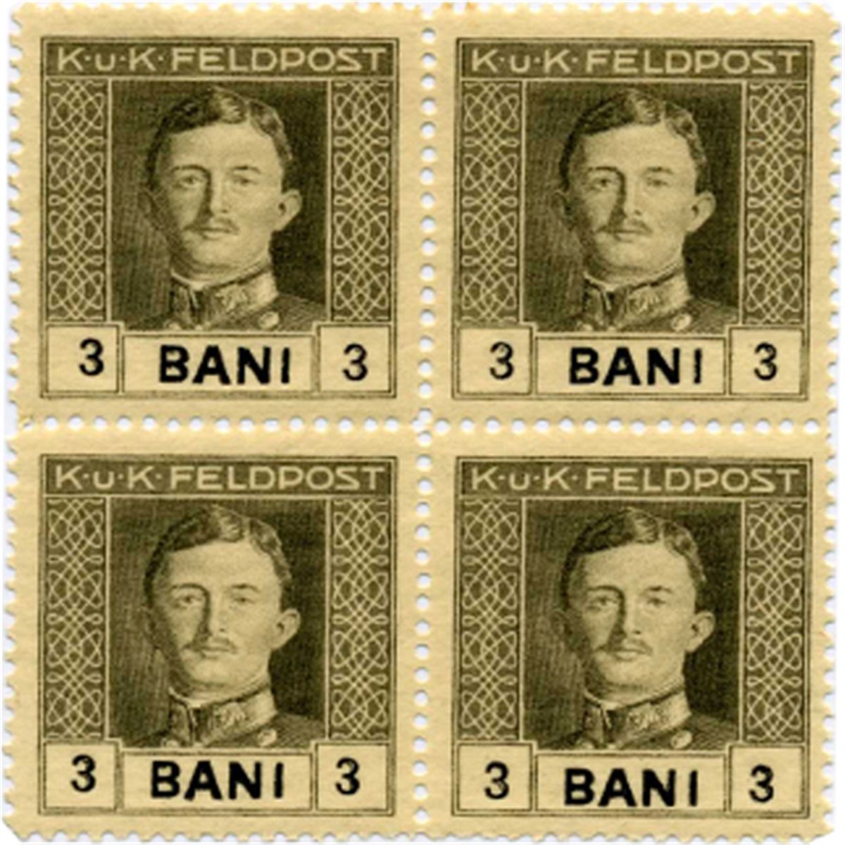 1918 Romania 3b Austria Occupation Carl 4 Block Error (STM-0477)