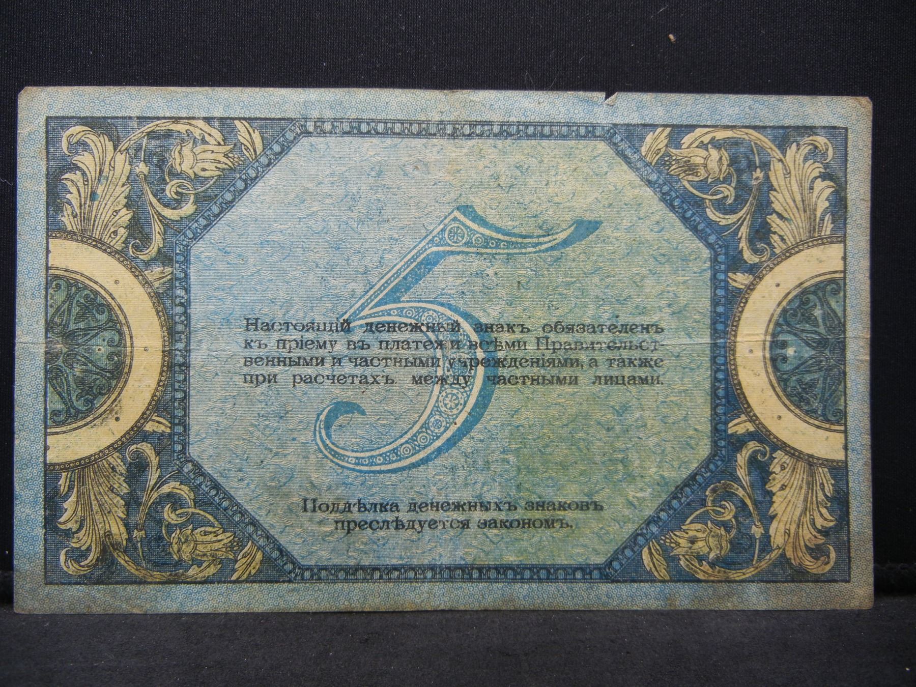 1918 Russia 5 Rouble State Treasury Note. Serial # AII-54