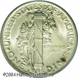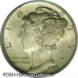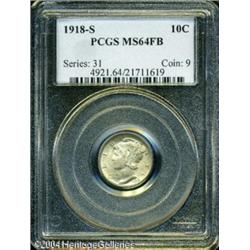 1918-S 10C MS64 Full Bands PCGS. This important ex <B>1918-S 10C MS64 Full Bands PCGS.</B></I> This important example does not display any abrasions that would appear to rule out a full Gem grade. Lustrous overall, the surfaces display soft gray iridescence particularly over the obverse. Fully brought up in the centers, some weakness shows at the reverse border. Two toning spots on the reverse help identify this Choice piece. <BR><BR><B>Important notice:</B> Heritage usually auctions material at the rate of 200-250 lots per hour. On some occasions eBay Live bid software or the Internet may not be able to keep up with the pace of the auction. We recommend placing a realistic absentee bid now as insurance to avoid disappointment. Occasionally the auctioneer may eliminate or reject an eBay Live bid, and the auctioneer may also reopen a lot after the close of the eBay live bidding (usually because we missed an audience bid), and may reject your bid even if it shows you as the winning bidder. By bidding via eBay Live, you agree that Heritage may award the lot to another bidder at its sole discretion under the circumstances described above or any other reasonable circumstances. Since eBay bids are not shown to us until we open the lot on the floor, we treat those bids just like floor bids. In most cases the floor responds before the eBay bid is presented to us, due to Internet lag time, so for consistency we have made it a policy that floor bids are always considered first over tie eBay live bids. Also please note that all Heritage lots purchased through eBay Live carry a 20% Buyer's Premium. Please make sure you read the Terms and Conditions before you bid. This lot is being auctioned in conjunction with a live floor auction by Heritage Galleries & Auctioneers. All final auction and invoice information will be supplied by Heritage Galleries & Auctioneers, and all other information should be considered preliminary. Lot:5797