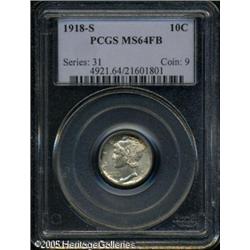 <B>1918-S 10C MS64 Full Bands PCGS.</B></I> This lustrous and nicely struck early branch mint example has undisturbed fields, although the cheek has a pair of tiny marks. Freckles of russet and gold patina dominate the margins, while the centers exhibit only faint tan hues. A scarce issue in Mint State, particularly with Full Bands. Population: 56 in 64, 44 finer (1/05). Lot:6347