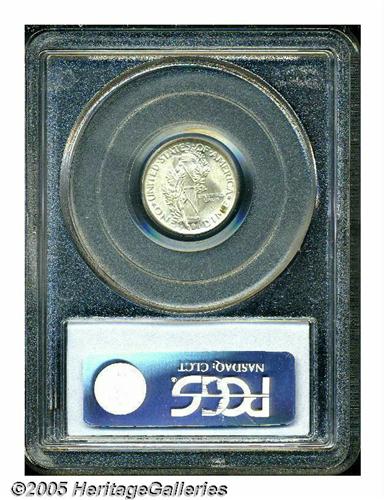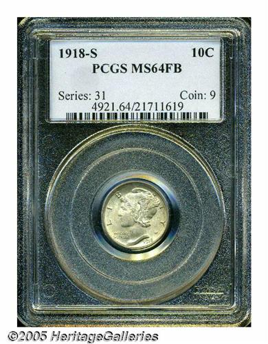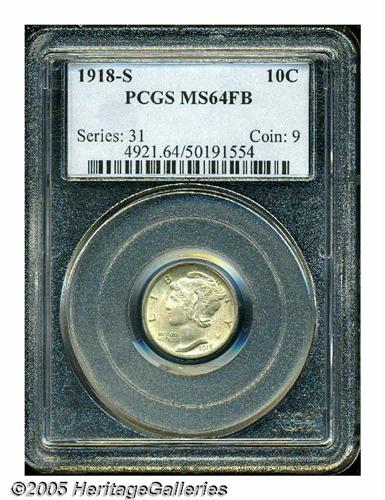 <B>1918-S<10C> MS64 Full Bands PCGS.</B></I> Well struck and satiny, with unusually crisp features overall and the absence of any appreciable surface marks. A small, multicolored toning spots rests near ME on the lower right reverse rim. Population: 52 in 64 Full Bands, 39 finer (4/05).