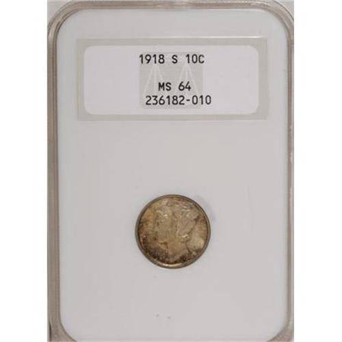 <B>1918-S 10C MS64 NGC.</B></I> NGC Census: (91/47). PCGS Population (96/42). Mintage: 19,300,000. Numismedia Wsl. Price for NGC/PCGS coin in MS64: $280. (#4920)<BR><BR><B>Coin Engraver:</B> Adolph A. Weinman<BR><BR><b>Shipping:</b> Coins & Currency (<a target="_blank" href="http://www.heritageauctions.com/common/shipping.php">view shipping information</a>)