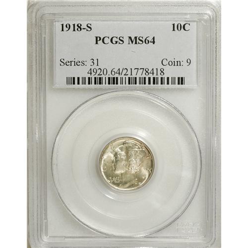 <B>1918-S 10C MS64 PCGS.</B></I> PCGS Population (92/41). NGC Census: (180/92). Mintage: 19,300,000. Numismedia Wsl. Price for NGC/PCGS coin in MS64: $280. (#4920)<BR><BR><b>Shipping:</b> Coins & Currency (<a target="_blank" href="http://www.heritageauctions.com/common/shipping.php">view shipping information</a>)