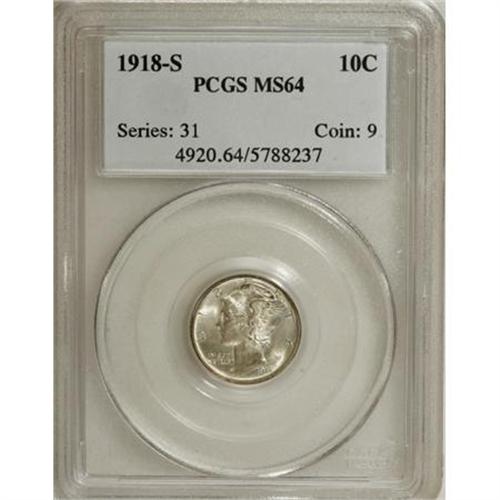 <B>1918-S 10C MS64 PCGS.</B></I> PCGS Population (94/41). NGC Census: (90/46). Mintage: 19,300,000. Numismedia Wsl. Price for NGC/PCGS coin in MS64: $280. (#4920)<BR><BR><B>Coin Engraver:</B> Adolph A. Weinman<BR><BR><b>Shipping:</b> Coins & Currency (<a target="_blank" href="http://www.heritageauctions.com/common/shipping.php">view shipping information</a>)
