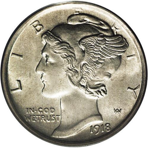<B>1918-S<10C> MS65 Full Bands PCGS.</B></I> The 1918-S is the most difficult S-mint Mercury dime to find with fully split bands and in Gem condition. This example offers light silver-gold patina, with the central bands fully split all along their length, while the often-weak diagonal bands show just a trace of weakness at their left (facing) sides. A single tick on Liberty's chin is noted for accuracy. Population: 22 in 65 Full Bands, 19 finer (4/06).