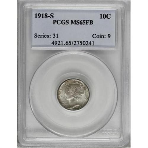 <B>1918-S 10C MS65 Full Bands PCGS.</B></I> This is a remarkably well produced and conditionally scarce example of the 1918-S dime, an issue that is notoriously rare with Full Bands. This Gem displays highly lustrous surfaces that are arrayed in lilac-gray and speckled toning on both sides. The matte-like surfaces are impressively preserved and nearly pristine, except for a couple of tiny marks on the lower fasces. Population: 22 in 65 Full Bands, 19 finer (12/07). <BR><BR><B>Coin Engraver:</B> Adolph A. Weinman<BR><BR><b>Shipping:</b> Coins & Currency (<a target="_blank" href="http://www.heritageauctions.com/common/shipping.php">view shipping information</a>)