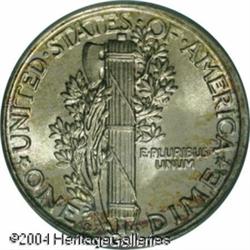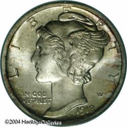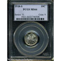 1918-S 10C MS66 Full Bands PCGS. Like its D-mint c <B>1918-S 10C MS66 Full Bands PCGS.</B></I> Like its D-mint counterpart, the 1918-S is the least available S-mint Dime with Full Bands and in Gem condition. This piece has bright mint frost and multicolored iridescence at the borders of each side. The central reverse bands are fully split, albeit barely, and the obverse peripheries did receive complete definition, with none of the frequently-seen fadeaway at the tops of RTY in LIBERTY. One contact mark is seen on Liberty's cheek the limits the already high grade. An important early Mercury Dime that will surely interest a great many advanced collectors. Population: 18 in 66, 2 finer (10/04). <BR><BR><B>Important notice:</B> Heritage usually auctions material at the rate of 200-250 lots per hour. On some occasions eBay Live bid software or the Internet may not be able to keep up with the pace of the auction. We recommend placing a realistic absentee bid now as insurance to avoid disappointment. Occasionally the auctioneer may eliminate or reject an eBay Live bid, and the auctioneer may also reopen a lot after the close of the eBay live bidding (usually because we missed an audience bid), and may reject your bid even if it shows you as the winning bidder. By bidding via eBay Live, you agree that Heritage may award the lot to another bidder at its sole discretion under the circumstances described above or any other reasonable circumstances. Since eBay bids are not shown to us until we open the lot on the floor, we treat those bids just like floor bids. In most cases the floor responds before the eBay bid is presented to us, due to Internet lag time, so for consistency we have made it a policy that floor bids are always considered first over tie eBay live bids. Also please note that all Heritage lots purchased through eBay Live carry a 20% Buyer's Premium. Please make sure you read the Terms and Conditions before you bid. This lot is being auctioned in conjunction with a live floor auction by Heritage Galleries & Auctioneers. All final auction and invoice information will be supplied by Heritage Galleries & Auctioneers, and all other information should be considered preliminary. Lot:5799