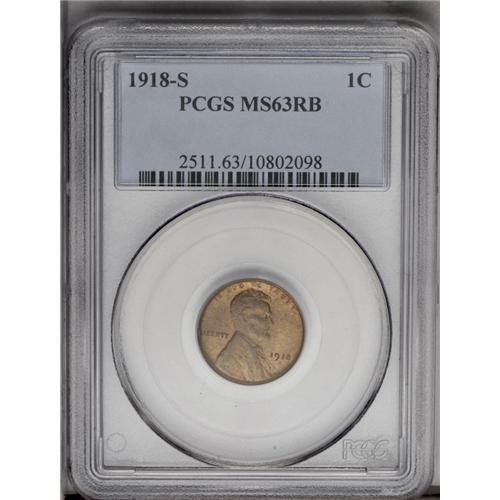 1918-S 1C MS63 Red and Brown PCGS. The obverse is from 1918-S[1C] MS63 Red and Brown PCGS.