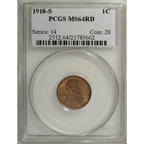 <B>1918-S 1C MS64 Red PCGS.</B></I> David Lange (2005) says of the 1918-S cent: " ... the typical pieces (are) brown or red/brown with poorly rendered details. Any fully red coin is a rarity ... " This near-Gem Red specimen exhibits copper-gold luster, and is somewhat better struck than typically seen, though minor softness is visible in some of the lines of the right-most stalk. A few minor flecks are scattered over reach side. Census: 21 in 64 Red, 7 finer (4/07).<BR><BR><b>Shipping:</b> Coins & Currency (<a target="_blank" href="http://www.heritageauctions.com/common/shipping.php">view shipping information</a>)