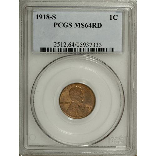 <B>1918-S 1C MS64 Red PCGS.</B></I> Lustrous and well struck with mint red color and carefully preserved surfaces. A few scattered flyspecks exist on each side. Only a tiny fraction of the original mintage has been certified in Mint State and with the Red color designation by the two major services. Population: 63 in 64 Red, 15 finer (4/07).<BR><BR><b>Shipping:</b> Coins & Currency (<a target="_blank" href="http://www.heritageauctions.com/common/shipping.php">view shipping information</a>)