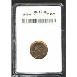 1918-S 1C MS64 Red and Brown ANACS. Yellow-green and rose in color. A bright and lustrous near-Gem with a nearly pristine reverse and a typical strike. Important notice: We expect to be auctioning lots at the rate of 200-250 per hour. Sometimes eBay Premier live bid software cannot keep up with that pace, so we strongly recommend that you place a realistic proxy bid now as insurance to avoid disappointment. Also please note that all Heritage/CAA lots purchased through eBay Premier carry a 20% Buyer's Premium. Please make sure you read the Terms and Conditions.