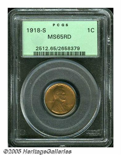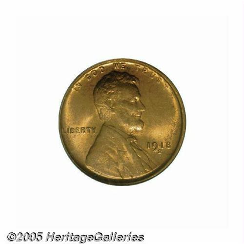 <B>1918-S<1C> MS65 Red PCGS.</B></I> Widespread circulation and poor striking quality are primarily responsible for the rarity of better grade 1918-S Lincoln Cents. This in addition to the normal tendency for mellowing further limits the availability of Gem Red survivors. Offered here is a vibrant golden-orange example with excellent sharpness for the issue. The only mentionable disturbance is a solitary carbon spot below the portrait at about 7 o'clock on the obverse border. Population: 15 in 65, 0 finer (6/05).<BR><I>From The William Bickel Collection, Part One.</B></I>