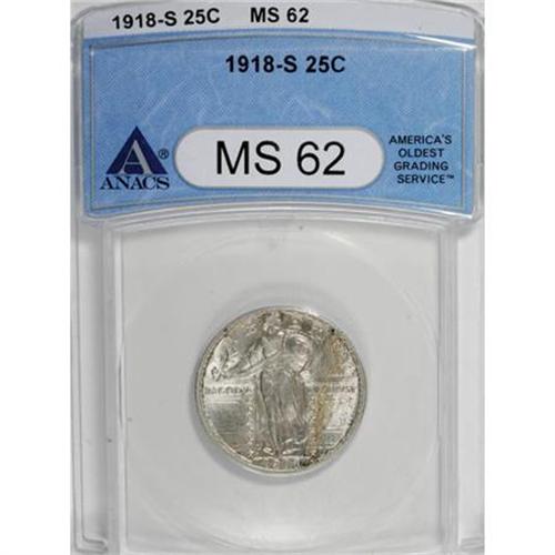 <B>1918-S 25C MS62 ANACS.</B></I> NGC Census: (73/313). PCGS Population (57/340). Mintage: 11,072,000. Numismedia Wsl. Price for NGC/PCGS coin in MS62: $208. (#5724)<BR><BR><B>Coin Engraver:</B> Hermon A. MacNeil<BR><BR><b>Shipping:</b> Coins & Currency (<a target="_blank" href="http://www.heritageauctions.com/common/shipping.php">view shipping information</a>)