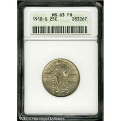 1918-S 25C MS63 Full Head ANACS. An exceptionally <B>1918-S 25C MS63 Full Head ANACS.</B></I> An exceptionally sharp full head is the hall mark of this Standing quarter. Generally well struck all around, though a couple of rivets on the lower left shield are missing, and the eagle's torso is weak. Light golden-gray color visits lustrous surfaces, and a few dark toning spots occur on Liberty's face and legs. <BR><BR><B>Important notice:</B> Heritage usually auctions material at the rate of 200-250 lots per hour. On some occasions eBay Live bid software or the Internet may not be able to keep up with the pace of the auction. We recommend placing a realistic absentee bid now as insurance to avoid disappointment. Occasionally the auctioneer may eliminate or reject an eBay Live bid, and the auctioneer may also reopen a lot after the close of the eBay live bidding (usually because we missed an audience bid), and may reject your bid even if it shows you as the winning bidder. By bidding via eBay Live, you agree that Heritage may award the lot to another bidder at its sole discretion under the circumstances described above or any other reasonable circumstances. Since eBay bids are not shown to us until we open the lot on the floor, we treat those bids just like floor bids. In most cases the floor responds before the eBay bid is presented to us, due to Internet lag time, so for consistency we have made it a policy that floor bids are always considered first over tie eBay live bids. Also please note that all Heritage lots purchased through eBay Live carry a 20% Buyer's Premium. Please make sure you read the Terms and Conditions before you bid. This lot is being auctioned in conjunction with a live floor auction by Heritage Galleries & Auctioneers. All final auction and invoice information will be supplied by Heritage Galleries & Auctioneers, and all other information should be considered preliminary. Lot:5946