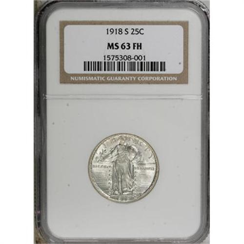 <B>1918-S 25C MS63 Full Head NGC.</B></I> A charming Select branch mint quarter from the early years of the Standing Liberty type. Lustrous and lightly toned with a bold date and a few weak shield rivets near the waist.<BR><BR><b>Shipping:</b> Coins & Currency (<a target="_blank" href="http://www.heritageauctions.com/common/shipping.php">view shipping information</a>)