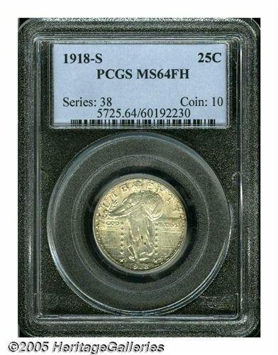 <B>1918-S<25C> MS64 Full Head PCGS.</B></I> The 1918-S is a tougher date to find in Mint State, and Full Head examples are especially scarce. This lightly toned and lustrous near-Gem is well struck on the date and on Liberty's head, and although her waist is not fully struck, the impressively preserved surfaces confirm the eye appeal. A tiny mark on Liberty's cheek is mentioned for accuracy, and a squiggly strike through is noted in the upper left (facing) obverse quadrant. Population: 73 in 64, 33 finer (6/05).